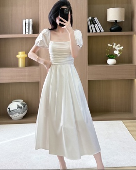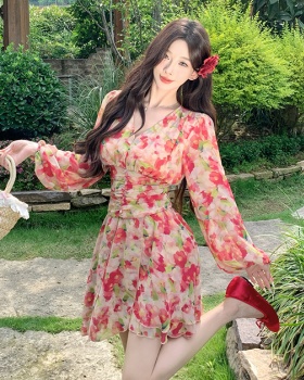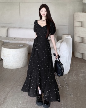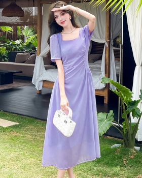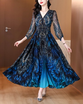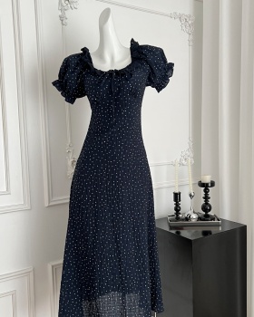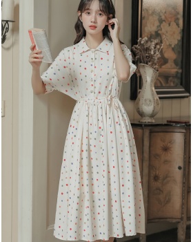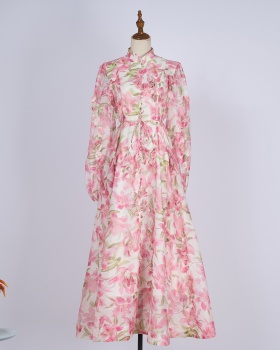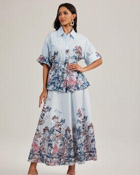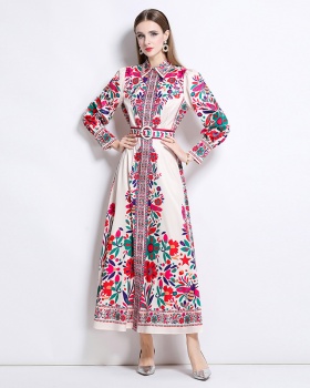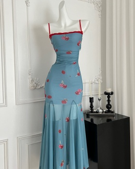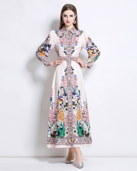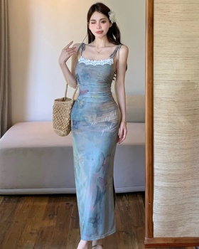 Summer blue dress printing pinched waist long dress
