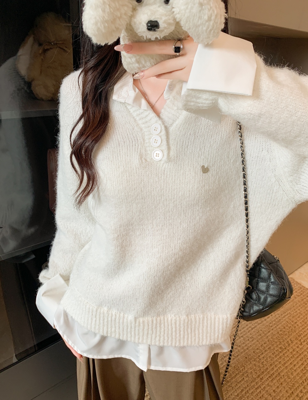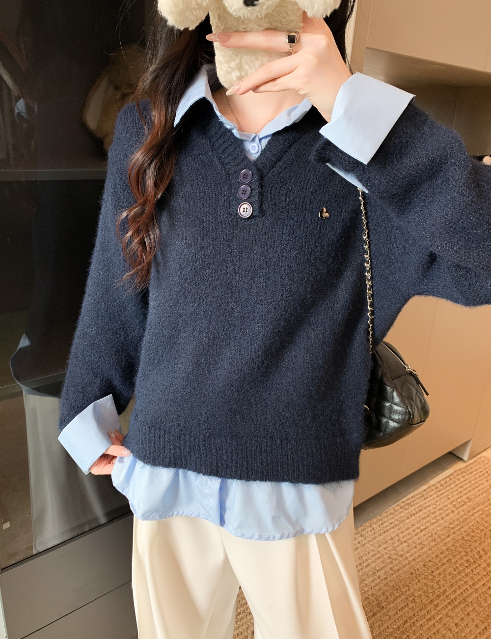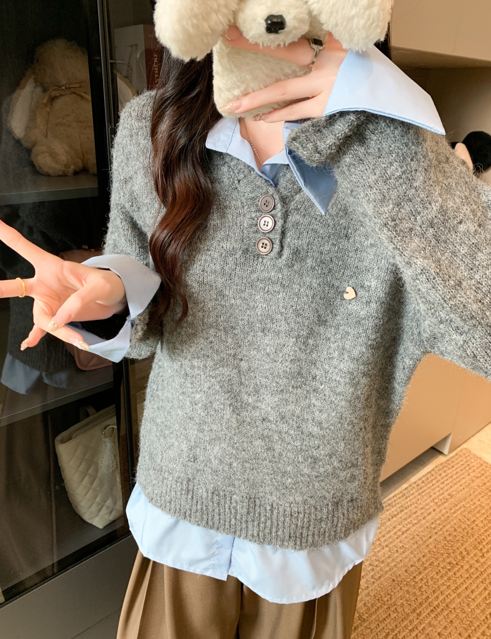 Autumn gray tops fashion Pseudo-two sweater for women