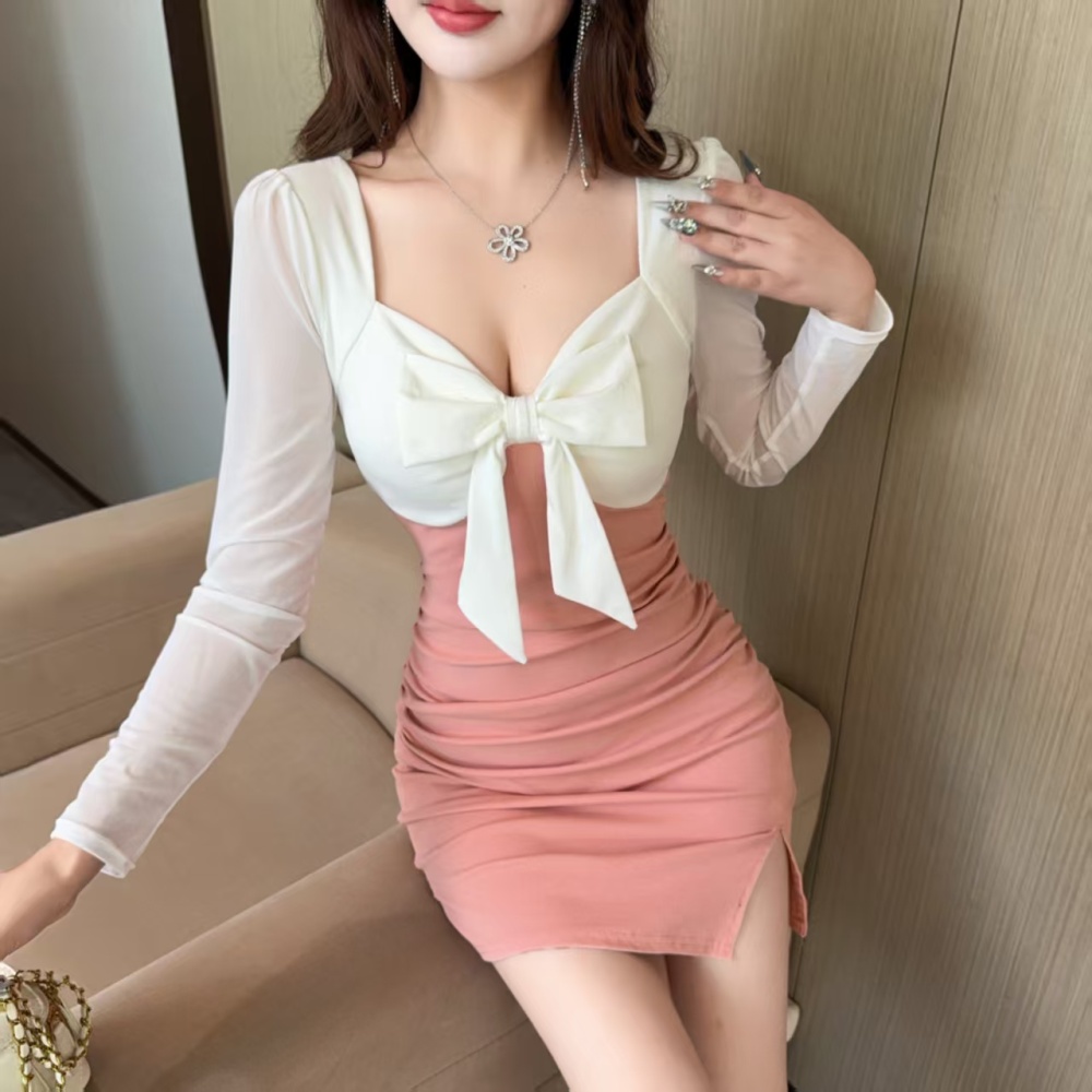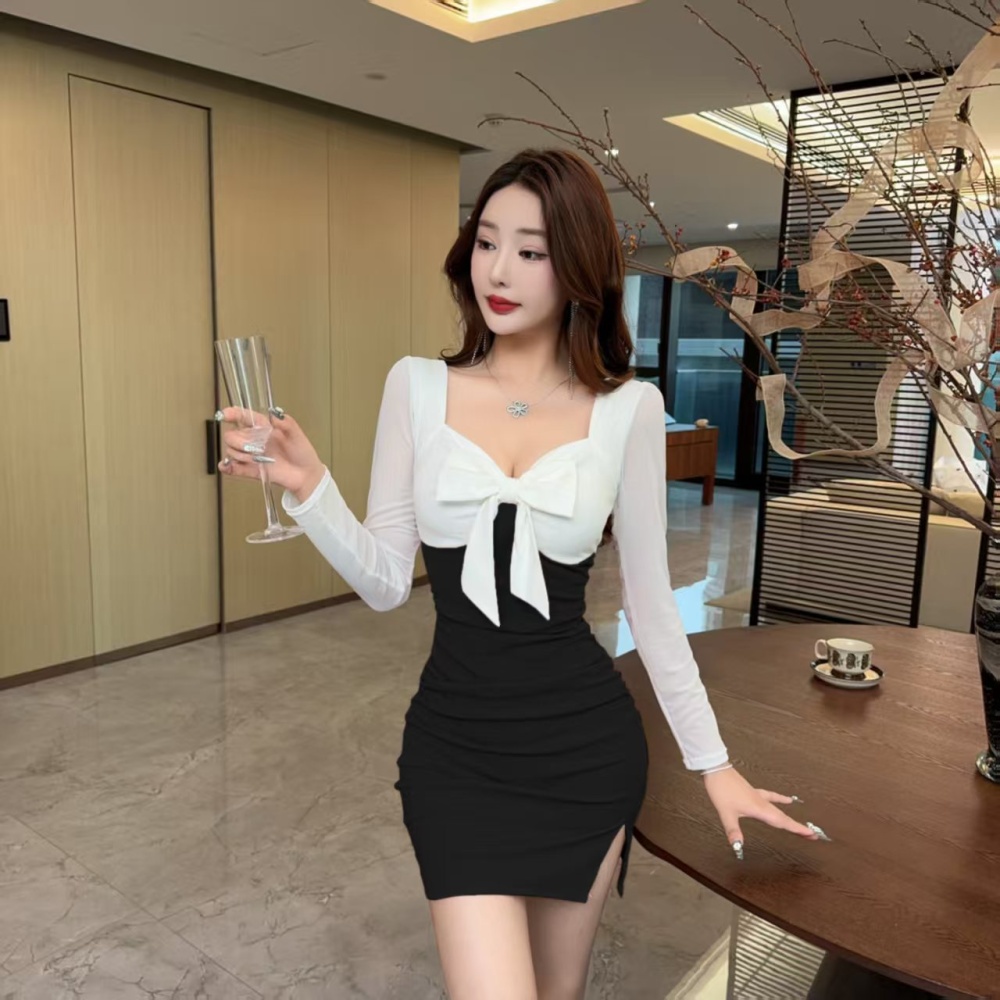 Bow ladies splice slim temperament fashion split dress