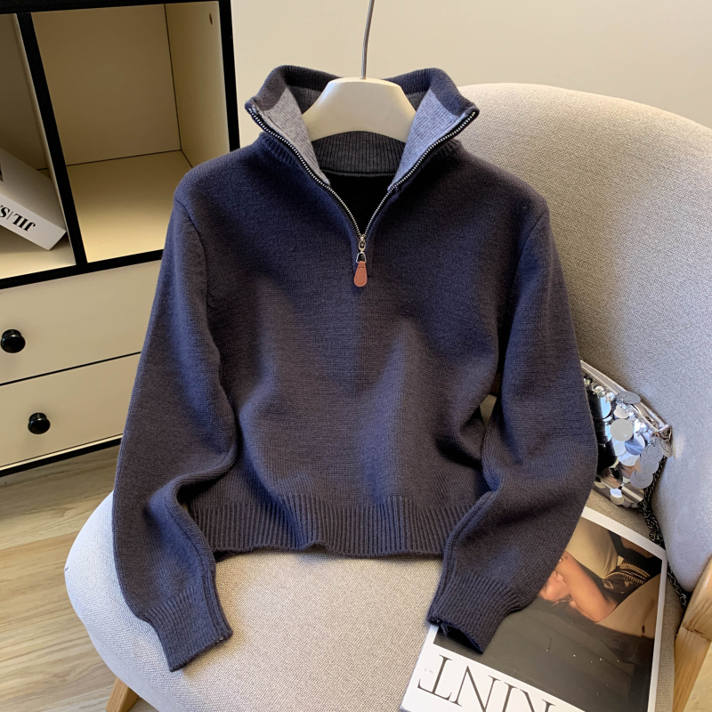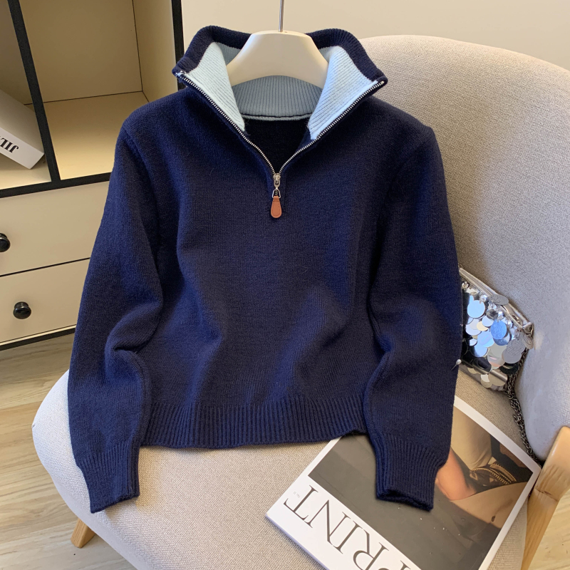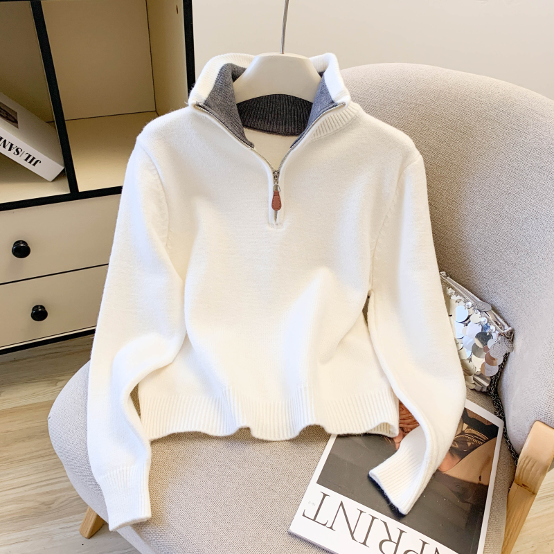 Contrast color collar Korean style sweater zip knitted tops