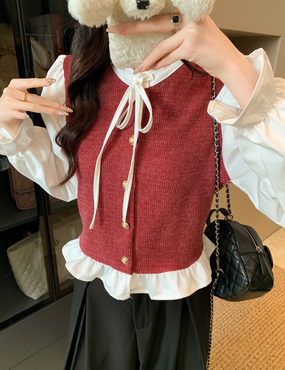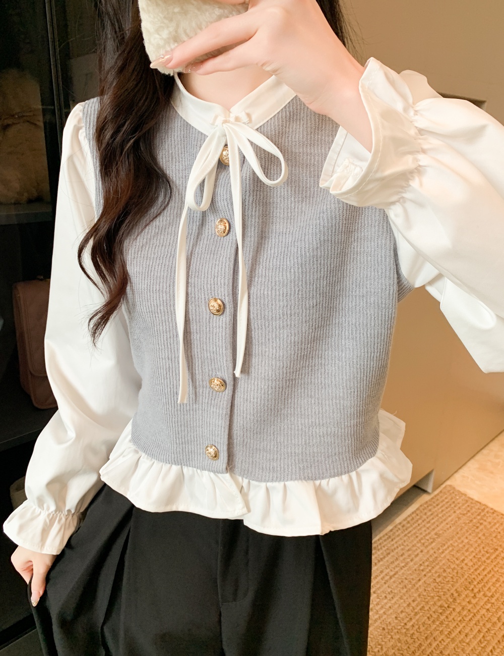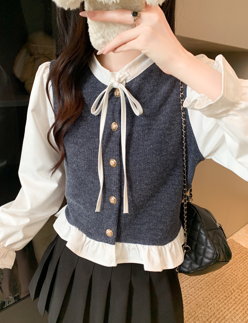 Elegant bow decoration splice tops cstand collar Pseudo-two shirt
