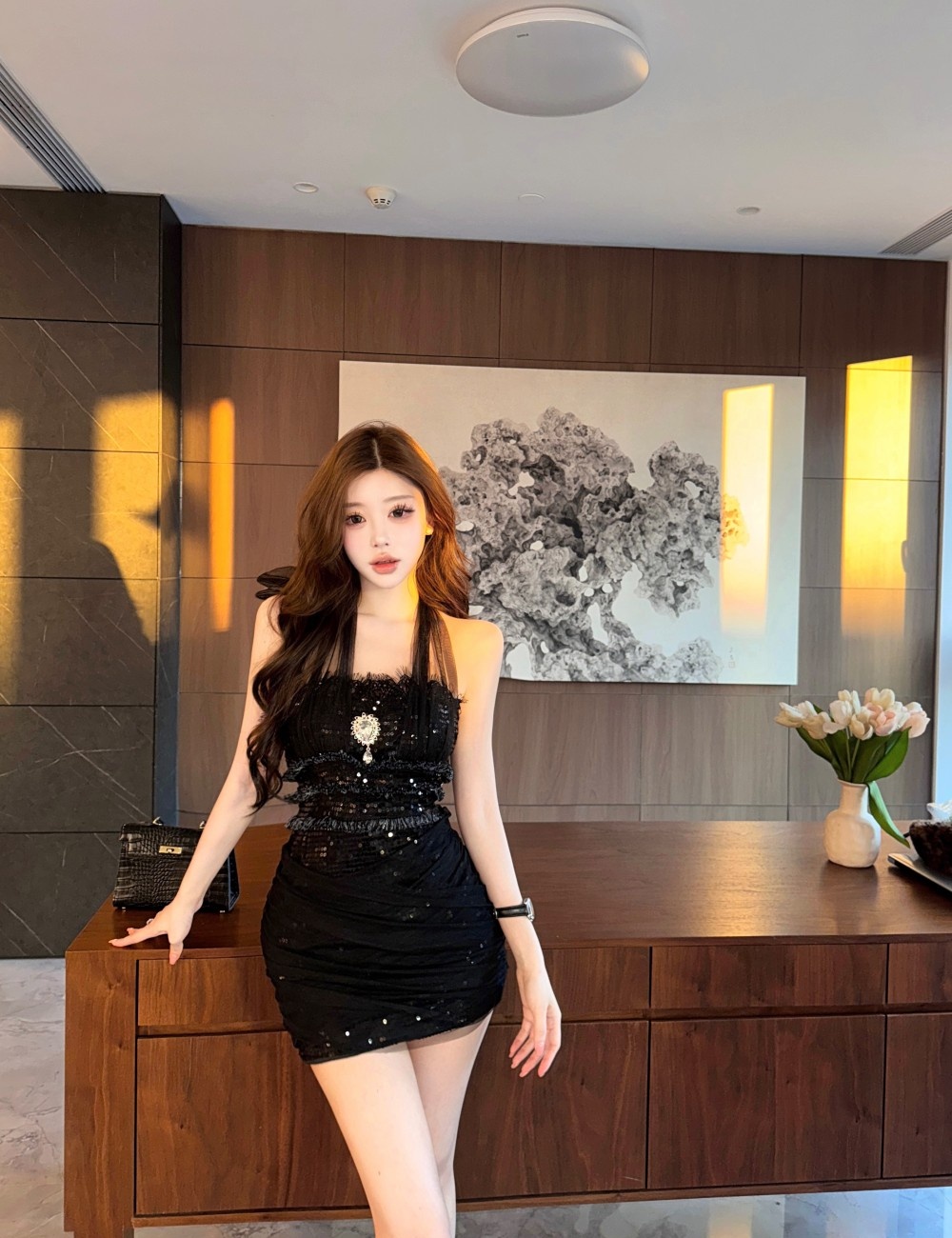 Halter long dress pinched waist dress for women