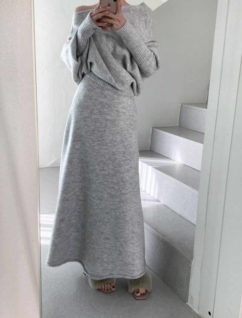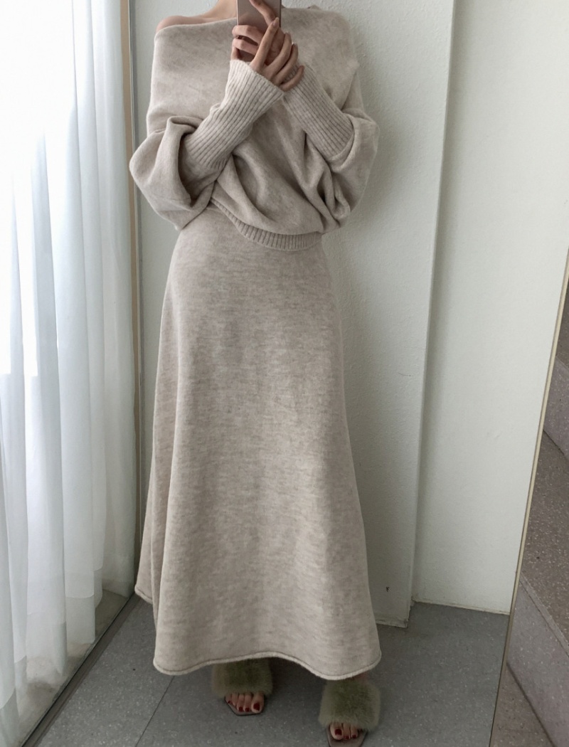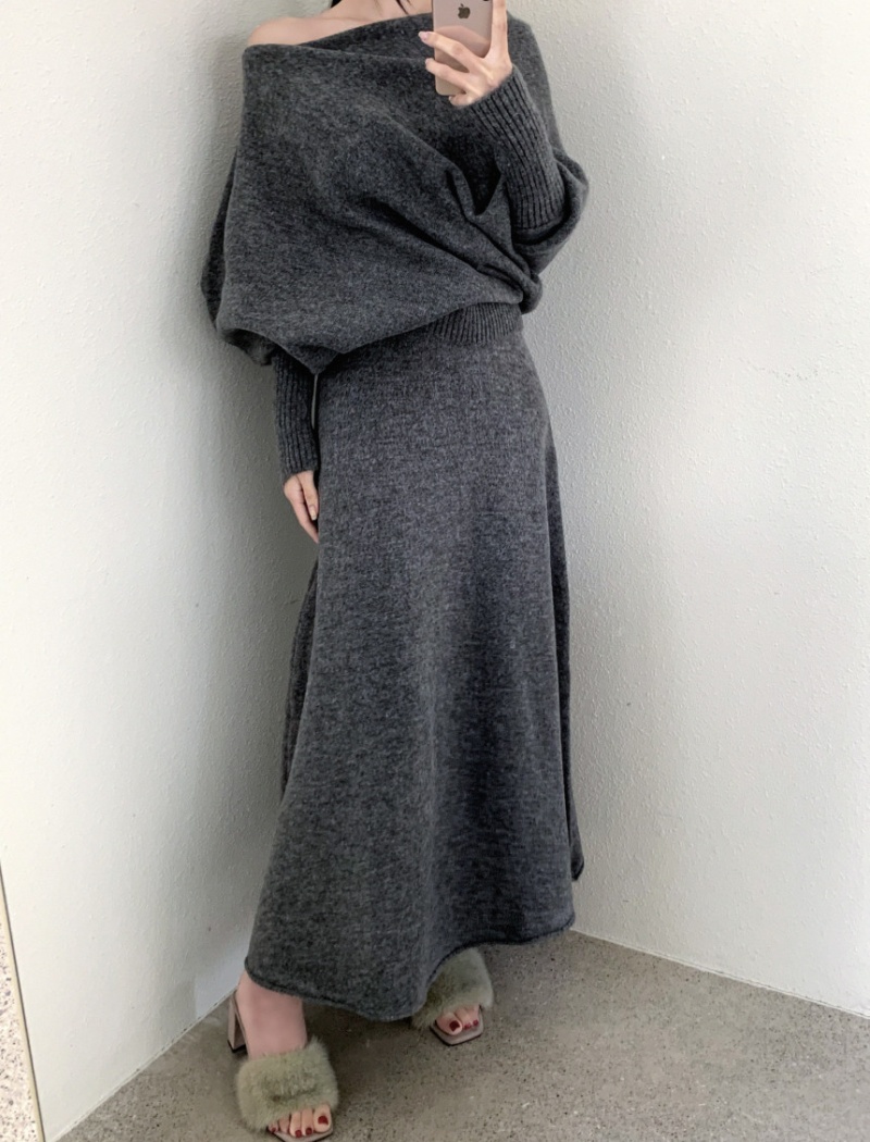 Knitted Casual tops flat shoulder loose skirt 2pcs set