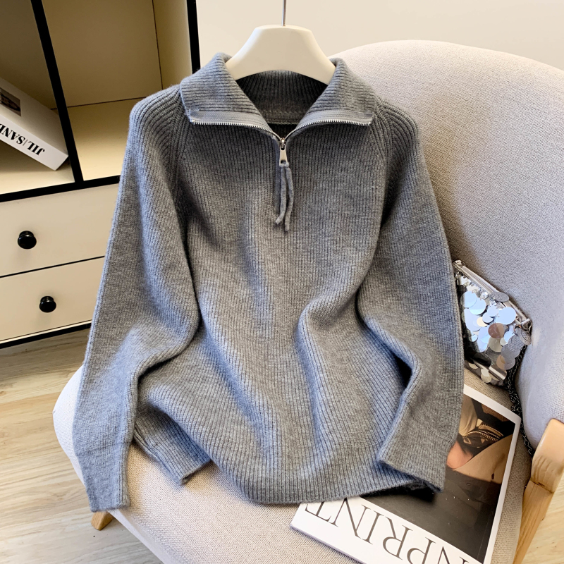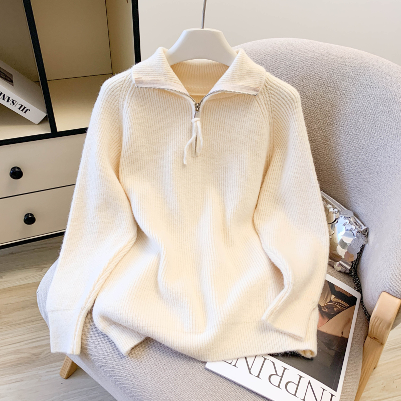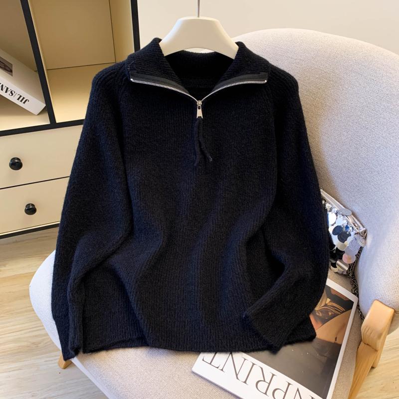 Loose lazy split half zip thick sweater for women