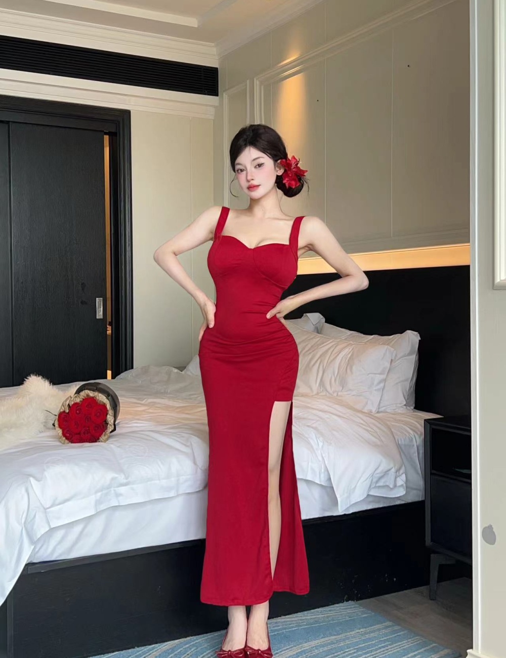 Hollow sling gauze jacquard long bottoming sexy dress