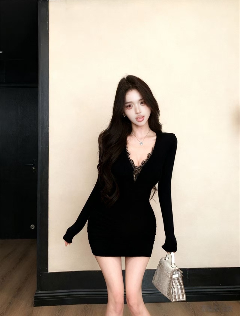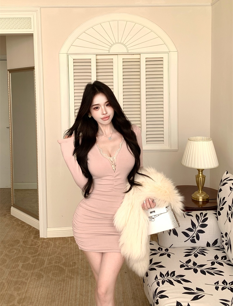 Package hip knitted fold lace V-neck enticement splice dress