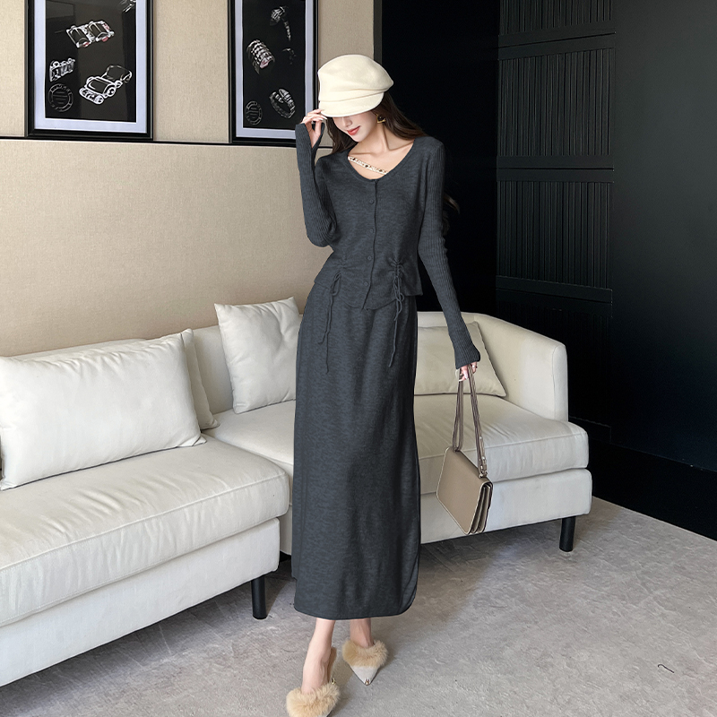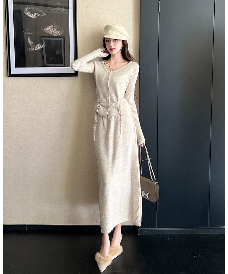 Pinched waist cardigan knitted skirt 2pcs set for women