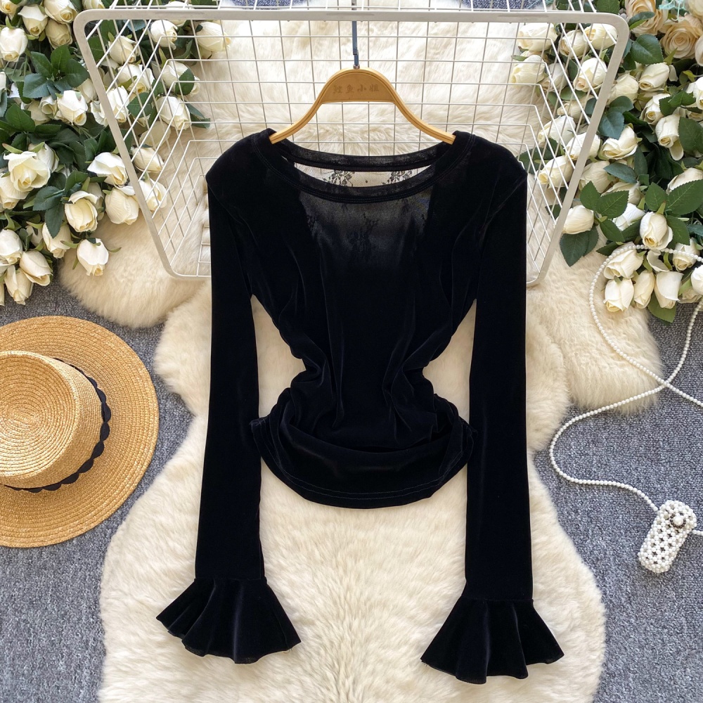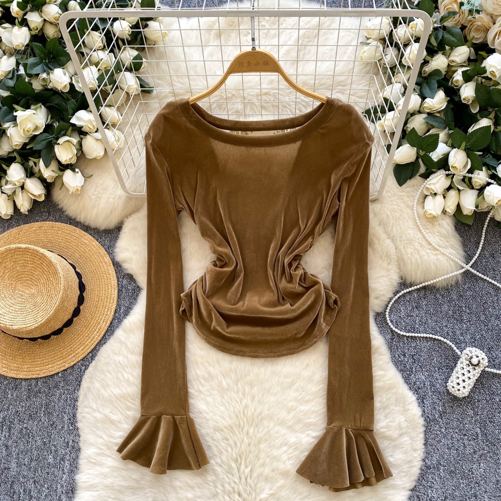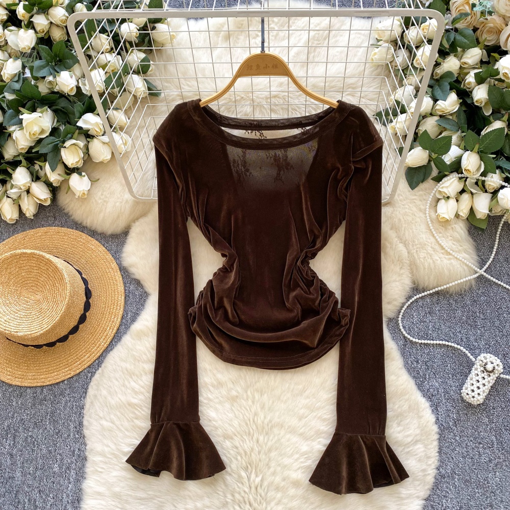 Pinched waist long sleeve lace shirt splice velvet tops for women