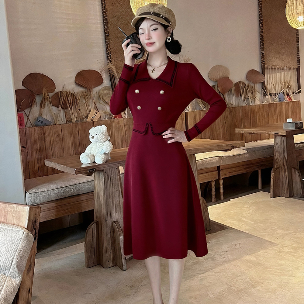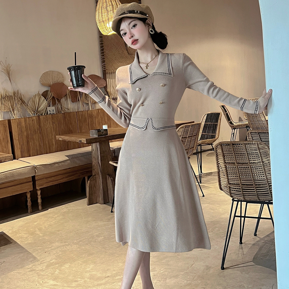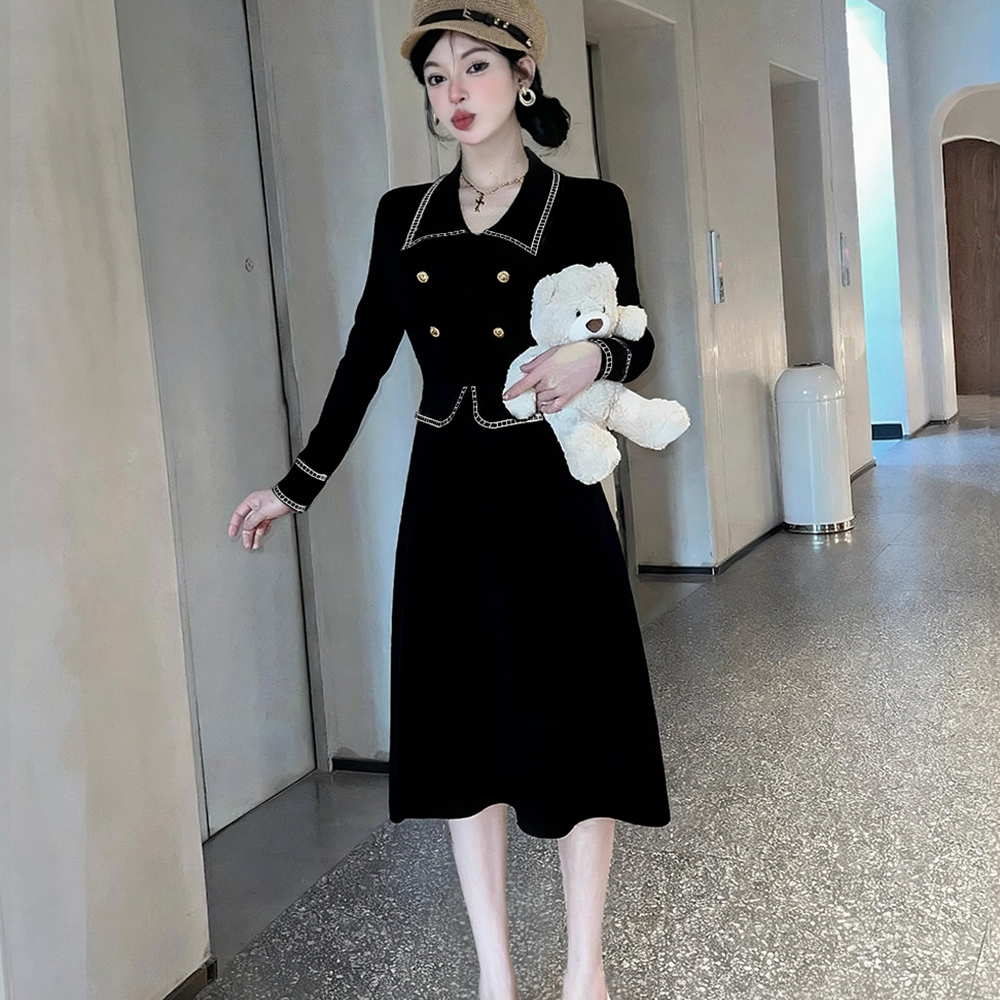 Long sleeve single-breasted mixed colors black-white dress