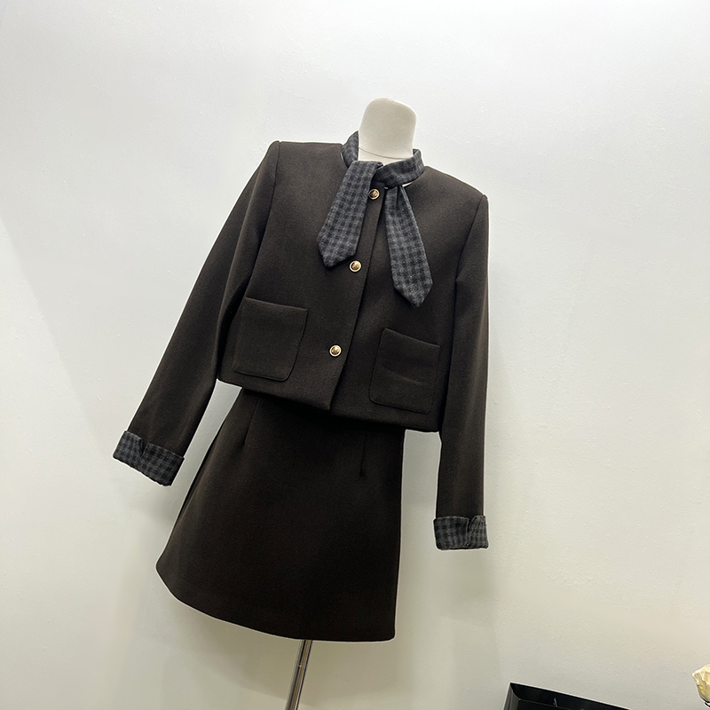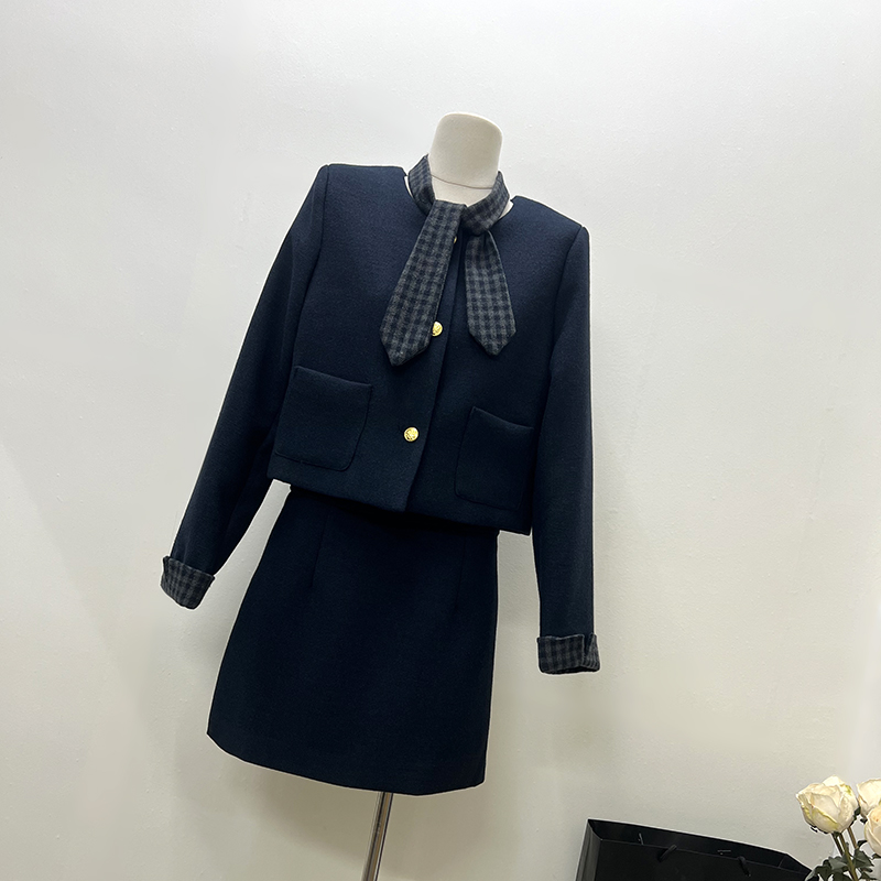 Plaid collar short skirt coat 3pcs set