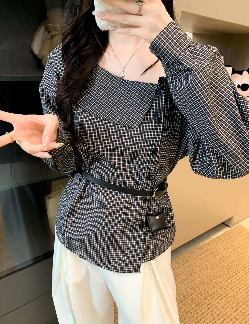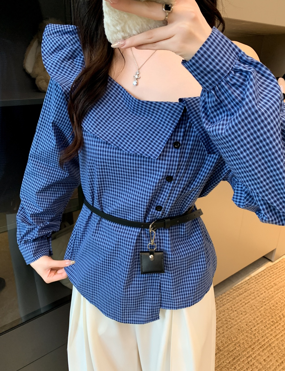 Plaid with belt shirt all-match Casual tops for women