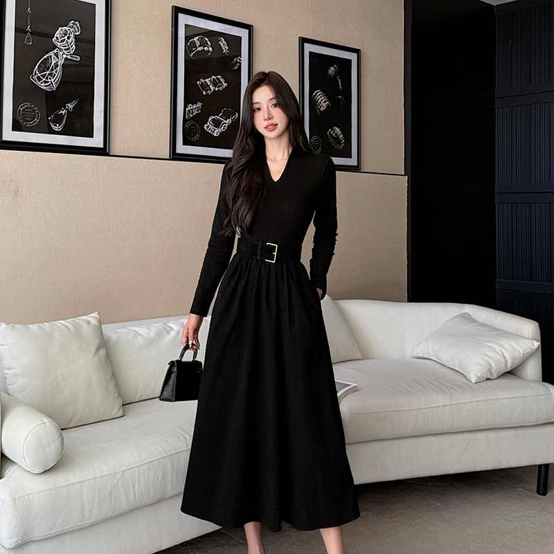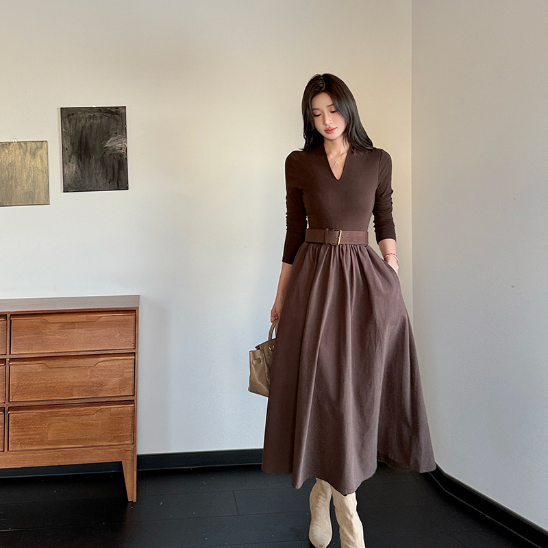 Printing V-neck niche jumpsuit big skirt retro long dress
