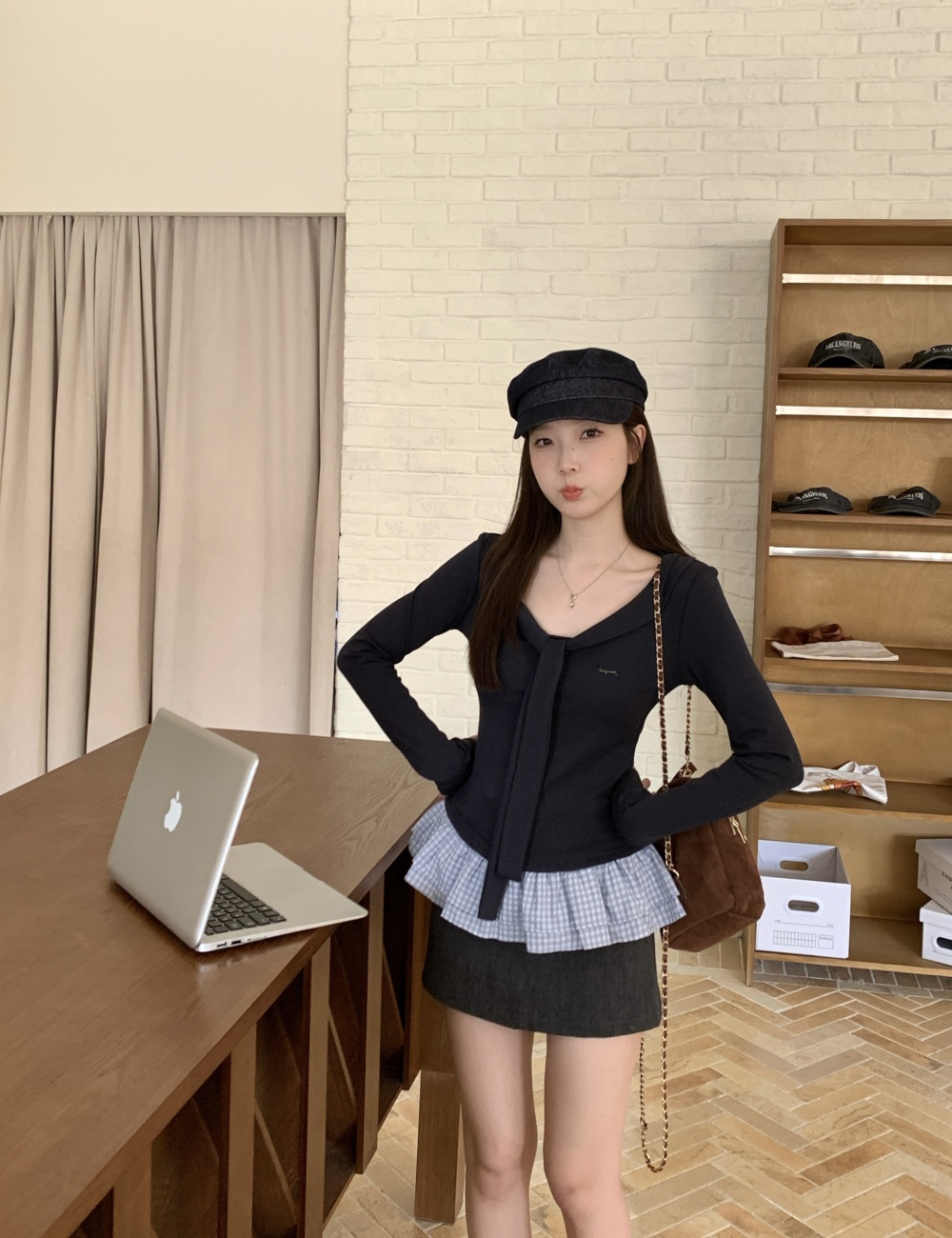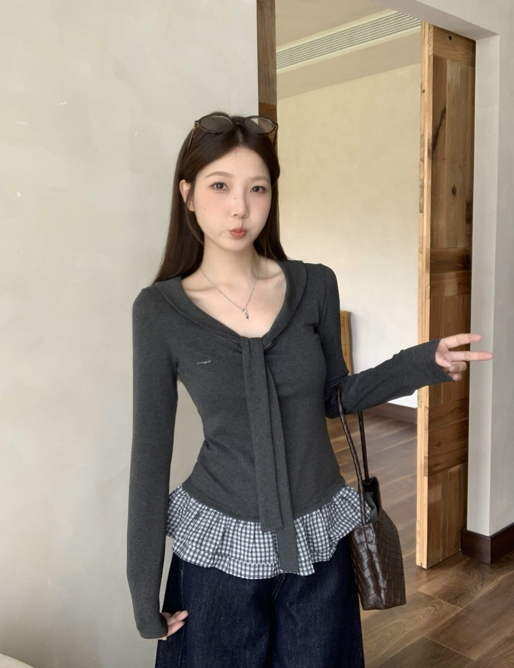 Pseudo-two long sleeve tops college style plaid T-shirt