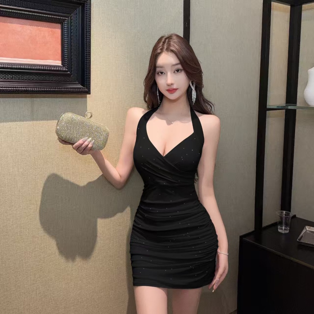 Low-cut A-line hollow vest pinched waist V-neck slim dress